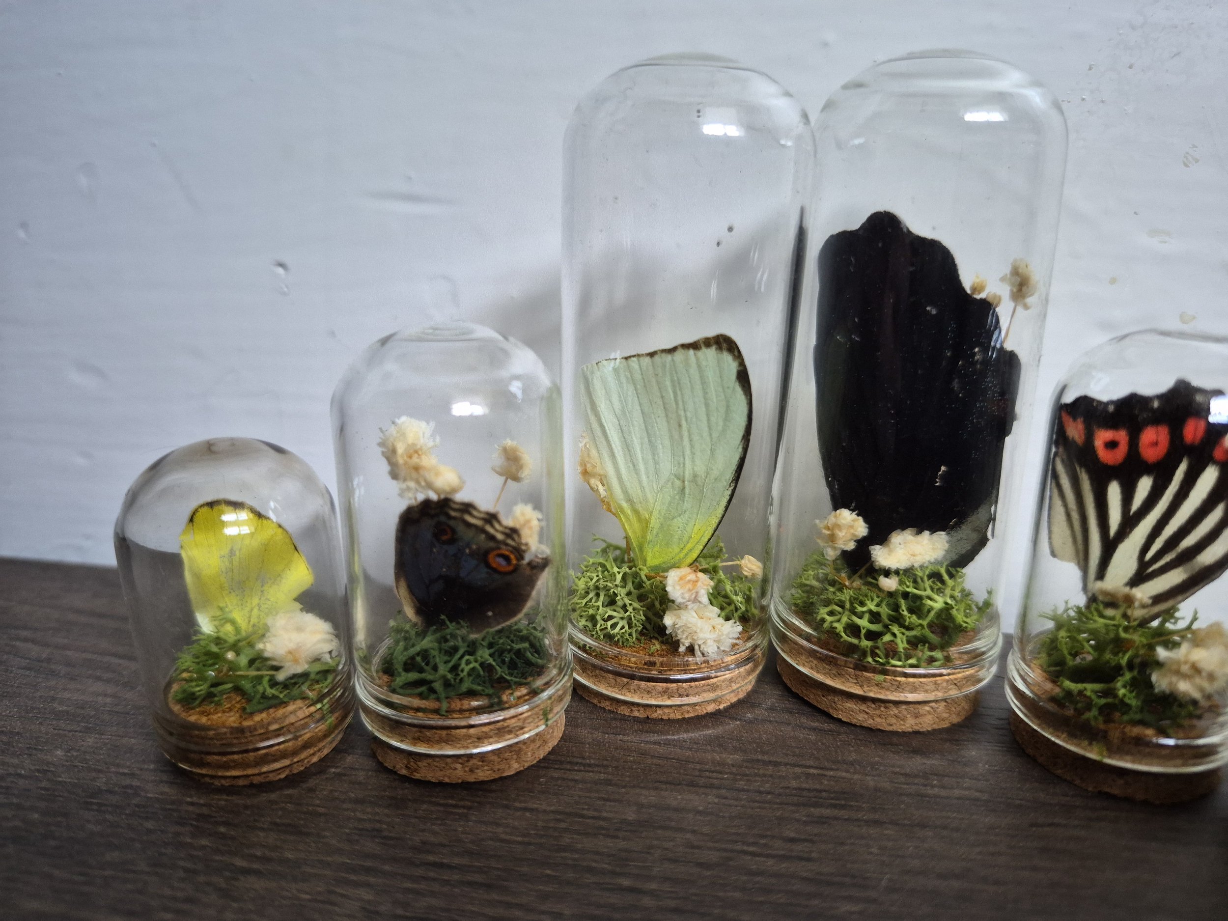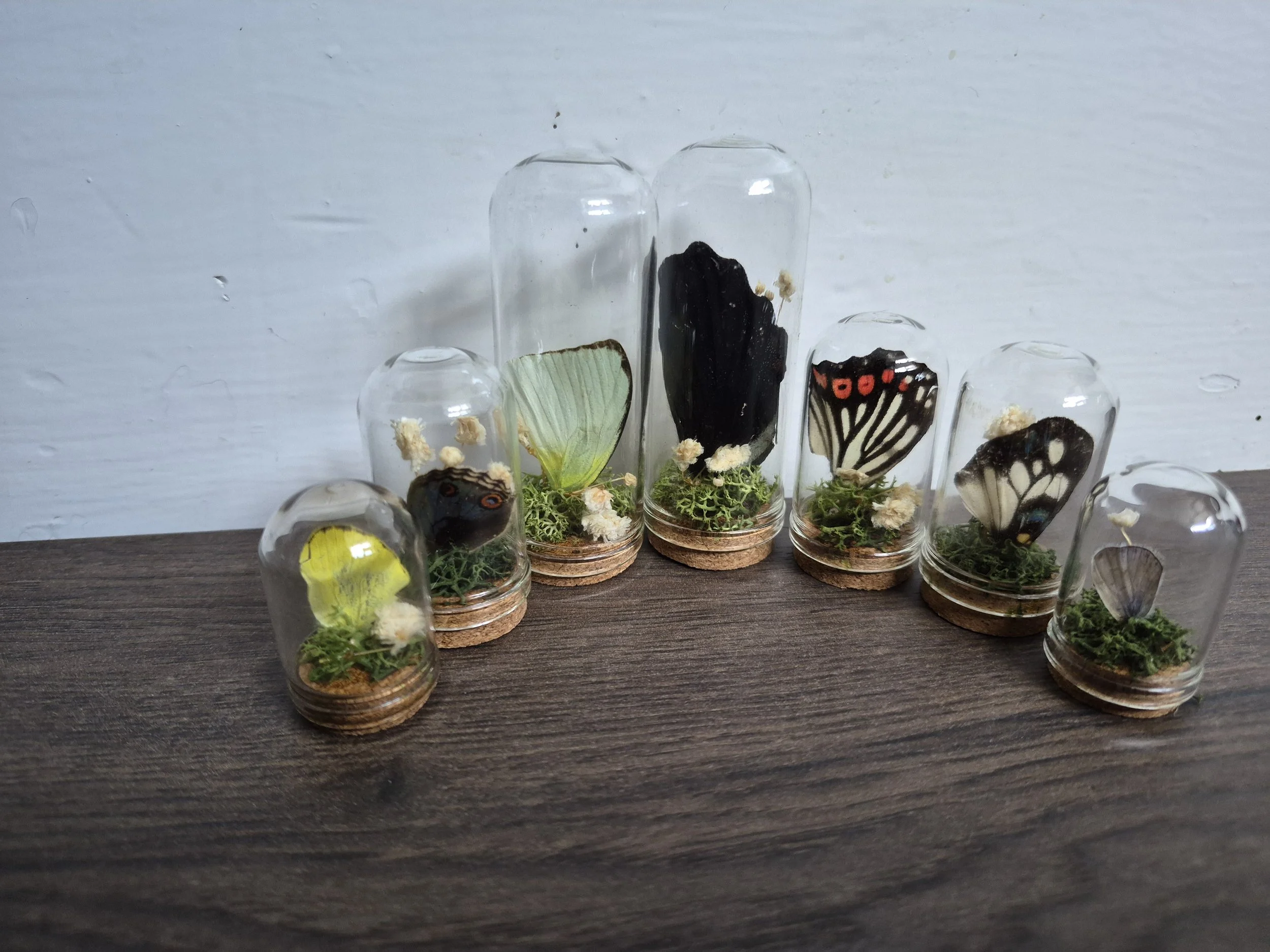 The butterfly wing is selected at random from a variety of species, ensuring that each piece is unique. The glass domes vary in size from approximately 1.5 to 3.0 inches in height, making it a perfect small accent piece. You can choose which size dome you would like in the variations.
